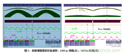 具體地講,圖3所示是開關(guān)頻率在寬輸入電壓(230Vac-左和115Vac-右)范圍和所有負(fù)載條件中(CCM-左, DCM - 右)保持恒定。與標(biāo)準(zhǔn)LM-FOT方法相比,本文提出的創(chuàng)新調(diào)制器的性能大幅改進(jìn),特別是在高壓線DCM運(yùn)行模式更為明顯,如圖4所示。