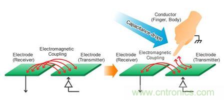 如下圖所示,在電容互感方式下,是檢測(cè)電容量的減少,來(lái)判斷按鍵是否按下。