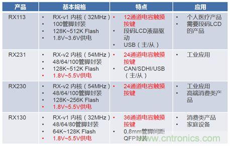 瑞薩電子提供4個(gè)產(chǎn)品系列,來(lái)適用于不同的應(yīng)場(chǎng)合,分別為RX113、RX130、RX230、RX231。