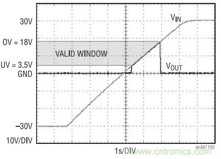 圖 2 示出了圖 1 電路中的 VIN 從 –30V 緩慢斜坡上升 至 30V 時做出的反應(yīng)。UV 和 OV 門限被分別設(shè)定為 3.5V 和 18V。當(dāng)電源電壓位于 3.5V 至 18V 窗口之內(nèi) 時, VOUT 跟隨 VIN 。若超出該窗口時,LTC4365 將 關(guān)斷 N 溝道 MOSFET,并使 VOUT 與 VIN 斷接,即使 在 VIN 為負值的情況下也不例外。