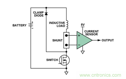 本例將詳細介紹一種典型的高端電流檢測應(yīng)用。圖1所示為汽車應(yīng)用環(huán)境中用于監(jiān)控電磁閥或其它感性負載的常見配置。