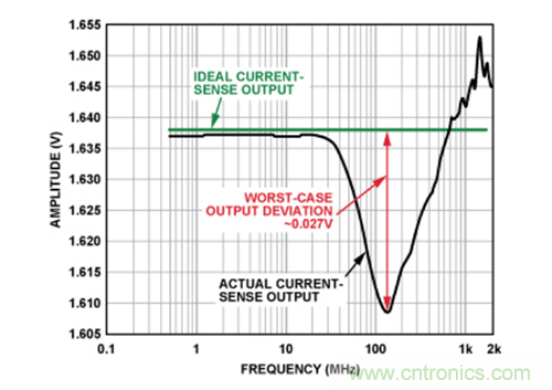 這種情況下,40 MHz時誤差僅為3 mV左右,且峰值誤差(大于100 MHz時)小于30 mV,性能提高35倍。這點清楚地表明,內(nèi)置EMI濾波電路有助于顯著提高電流傳感器防護性能,使其免受輸入端存在的高頻信號影響。在實際應(yīng)用中,盡管并不清楚EMI的嚴重程度,但是如果使用內(nèi)置EMI濾波功能的電流傳感器,實際上控制環(huán)路將會保持在其容差范圍內(nèi)。
