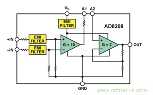 AD8208的更多詳情:AD8203(圖A)是一款單電源差動放大器,非常適合在大共模電壓情況下放大和低通濾波小差分電壓。采用+5 V單電源供電時,輸入共模電壓范圍為-2 V至+45 V。該款放大器提供增強的輸入過壓和ESD保護,并內(nèi)置EMI濾波功能。