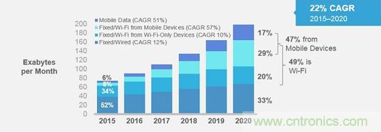 移動網(wǎng)絡(luò)和Wi-Fi流量占有率比較。固定式/Wi-Fi流量自2018年起超越固定式/有線(wired)網(wǎng)絡(luò)流量(來源:Cisco)