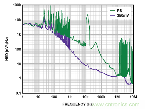 當(dāng)裕量為 350 mV 時(shí),LDO 采用壓差工作模式。此時(shí),LDO 再也不能調(diào)節(jié)輸出電壓,充當(dāng)一個電阻,輸出噪聲升至近 76 μVrms,如圖 9 所示。只有 FET 的 RDSON和輸出端的電容形成的極點(diǎn)衰減輸入噪聲。