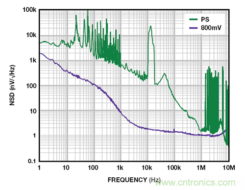 如 ADM7150 超低噪聲、高 PSRR 調(diào)節(jié)器一類的新型 LDO 實(shí)際上級聯(lián)了兩個 LDO,因此,結(jié)果得到的 PSRR 約為各個級之和。這些 LDO 要求略高的裕量電壓,但能夠在 1 MHz 條件下實(shí)現(xiàn)超過 60 dB 的 PSRR,較低頻率下,PSRR 可以遠(yuǎn)超 100 dB。圖 7 所示為一個 5 V 的 ADM7150 的噪聲頻譜密度,其負(fù)載電流為 500 mA,裕量為 800 mV。10 Hz 至 100 kHz 范圍內(nèi),輸出噪聲為 2.2 μV rms。隨著裕量降至 600 mV,整流諧波開始顯現(xiàn),但當(dāng)輸出噪聲升至 2.3 μV rms 時(shí),其對噪聲的影響很小。