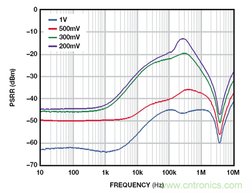 LDO 電源抑制比(PSRR)與裕量電壓相關(guān)——裕量電壓指輸入與輸出電壓之差。對于固定裕量電壓,PSRR 隨著負(fù)載電流的提高而降低,大負(fù)載電流和小裕量電壓條件下尤其如此。圖 1 所示為 ADM7160 超低噪聲、2.5 V 線性調(diào)節(jié)器在 200 mA 負(fù)載電流和 200 mV、300 mV、500 mV 和 1 V 裕量電壓條件下的 PSRR。