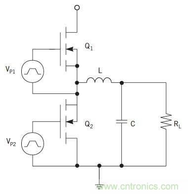 圖1:降壓轉(zhuǎn)換器拓?fù)浣Y(jié)構(gòu)使用兩個(gè)n溝道MOSFET。Q 1是開關(guān)或控制MOSFET,Q 2是同步整流器。L和C包括輸出濾波器,R L是負(fù)載電阻。
