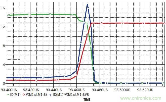 圖2:開關(guān)Q 1產(chǎn)生I D(綠色)和V DS(紅色)的特征波形。這兩個(gè)波形的乘積給出了瞬時(shí)功耗P D(藍(lán)色)。
