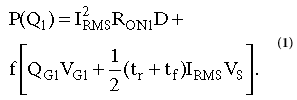 在等式1中,第一項(xiàng)反映了傳導(dǎo)損耗,第二項(xiàng)反映了動(dòng)態(tài)和柵極損耗。I RMS是漏極電流; R ON是溝道電阻; D是占空比; f是開關(guān)頻率; t r和t f分別是切換上升和下降時(shí)間; 和V S是輸入源電壓。