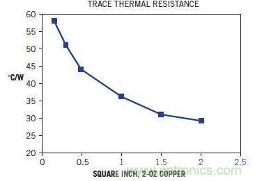 圖3:您可以表示2盎司銅印刷電路板走線的熱阻,單位為攝氏度/瓦,與走線面積的函數(shù)關(guān)系。這種厚度的銅是大多數(shù)印刷電路板的典型特征。