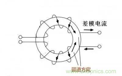 共模電感會(huì)飽和嗎?答案是非常難飽和,通常情況下無需擔(dān)心飽和問題,為什么呢?我們先來看看差模電流流過共模電感的情況。如圖,差模電流電流電感時(shí)其磁通是相互抵消的,也就是說,在磁路里基本沒有磁通產(chǎn)生,差模電流流過時(shí)沒有阻力,沒有損耗,簡(jiǎn)單說,一個(gè)額定電流5A的共模電感流過100A的差模電流也不會(huì)飽和,當(dāng)然前提是導(dǎo)線夠粗。