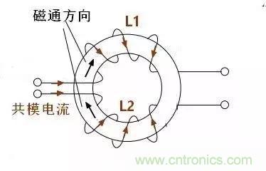 假設(shè)一對(duì)共模電流流向如下圖所示,兩個(gè)濾波電感各自獨(dú)立,沒有磁通上的聯(lián)系,這樣能不能濾波共模電流呢?當(dāng)然也能,相當(dāng)于差模電感,各自為戰(zhàn),效果差一點(diǎn)。