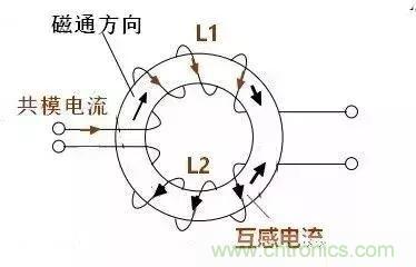1)L1的磁通會(huì)使L2產(chǎn)生互感電動(dòng)勢(shì),互感電動(dòng)勢(shì)的方向總是要阻礙磁通的增加,于是在L2中產(chǎn)生和共模電流方向相反的電流,L2的共模電流被抵消,反之,L1對(duì)L2的互感電流也是與L1的共模電流方向相反,也就是說L1的共模電流被抵消。如下圖所示,L2中的互感電流與L2的共模電流方向相反的: