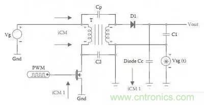 共模干擾由MOS管的高di/dt引起,經(jīng)過變壓器間的電容Cp或雜散電容C2傳到副邊,以Cp為主,C2基本可忽略。我們知道Cp很小,因此能傳到副邊的干擾頻率一定很高,低頻干擾信號(hào)過不去,因此EMI測(cè)試中的高頻部分基本就是共模干擾。究竟多少M(fèi)Hz與變壓器的結(jié)構(gòu)有很大的關(guān)系,層間電容大了則可能1MHz的共模能過去,層間電容小了,則只能是更高的頻率能過去,比如5MHz以上。