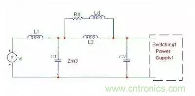 這是用的最多的一種,如圖,通常都僅僅在電感上并聯(lián)一個(gè)阻尼電阻,這個(gè)阻尼電阻不可少,曾經(jīng)看到有些貼問這個(gè)電阻干什么用,有各種說法,但很少有說對(duì)的,請(qǐng)記住這個(gè)是阻尼電阻,為了消除干擾信號(hào)在濾波器的截止頻率處產(chǎn)生尖峰,達(dá)到243樓的的幅頻特性的加阻尼后的效果。有人說前面一個(gè)C1電容可以省去,這個(gè)說法不對(duì)的,我們前面已講過,每加一個(gè)儲(chǔ)能元件 L 或 C,濾波器的階數(shù)并升高一階,對(duì)信號(hào)的衰減可以增加20dB/十倍頻程,pi 濾波器是三級(jí)濾波器,把C1拿掉后變成了二階,濾波效果會(huì)打折扣。
