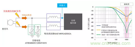 TDK開發(fā)了音頻線用噪音濾波器MAF系列作為抑制此類問題的元件。通過將MAF系列用于麥克風(fēng)線中,能夠在不降低音頻質(zhì)量的情況下抑制TDMA噪音。