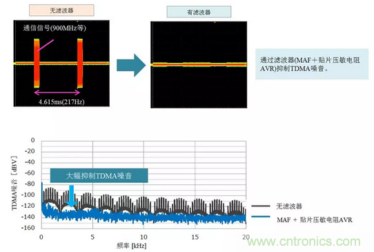 通過同時(shí)使用MAF與貼片壓敏電阻對(duì)于抑制TDMA噪音擁有極佳的效果
