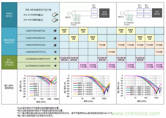 TDK推薦用于抑制麥克風(fēng)線蜂窩網(wǎng)絡(luò)頻帶(700MHz~1GHz、 1.5GHz~2.8GHz)以及WiFi (2.4GHz、3~5GHz) 的TDMA噪音、改善接收靈敏度、抑制ESD的MAF系列與貼片壓敏電阻AVR系列的產(chǎn)品組合示例如下所示(圖9)。