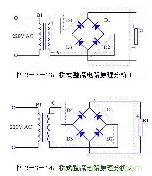 由圖2-3-13可以看出在電源正半周時,B1次級上端為正,下端為負,整流二極管D4和D2導通,電流由變壓器B1次級上端經(jīng)過D4、R1、D2回到變壓器B1次級下端;由圖2-3-14可以看出在電源負半周時,B1次級下端為正,上端為負,整流二極管D1和D3導通,電流由變壓器B1次級下端經(jīng)過 D1、R1、D3回到變壓器B1次級上端。R1兩端的電壓始終是上正下負,其波形與全波整流時一致。