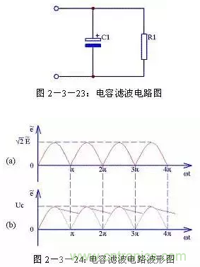 電容濾波電路圖見圖2-3-23,電容濾波電路是利用電容的充放電原理達到濾波的作用。在脈動直流波形的上升段,電容C1充電,由于充電時間常數(shù)很小,所以充電速度很快;在脈動直流波形的下降段,電容C1放電,由于放電時間常數(shù)很大,所以放電速度很慢。在C1還沒有完全放電時再次開始進行充電。這樣通過電容C1的反復充放電實現(xiàn)了濾波作用。濾波電容C1兩端的電壓波形見圖2-3-24(b)。