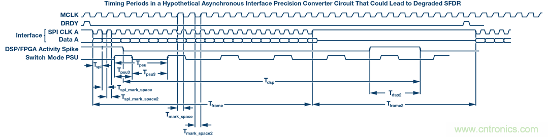 在圖15中,標(biāo)記了各種定時周期,這很容易干擾SFDR或?qū)е露秳?。如果SPI通信未頻鎖到MCLK,則可能發(fā)生雜散。掌握布局技術(shù)是您緩解此問題的最大保障。頻率表現(xiàn)為混疊下行干擾源,但也作為拍頻和交調(diào)產(chǎn)物。例如,如果SPI在16.01 MHz下運行,MCLK在16 MHz下運行,則應(yīng)在10 kHz下發(fā)生雜散。