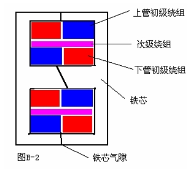 最后說一說繞組線圈的結(jié)構(gòu),因為膽機的后級都是用對管組成推挽電路的,為了防止由于兩管負載不平衡所引鐵芯起直流磁化,上下管的負載繞組不僅要做到電感一致,并且直流電阻也要一致,另外為了較少線間分布電容,在繞法上采取分層分邊的繞法,如圖B-2是音頻輸出變壓器繞組的結(jié)構(gòu)剖面圖。這種繞組結(jié)構(gòu)可使上下輸出管的總電抗保持一致,從減少線間的分布電容的角度來看,層分得越多越細越好,從而使輸出信號的頻響特性得到較好的改善。