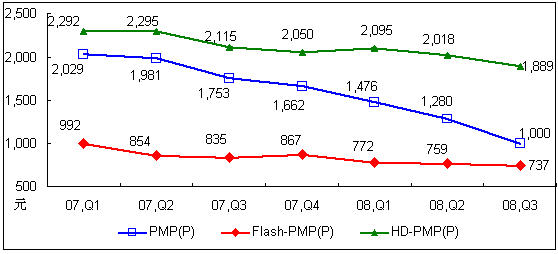 2007年Q1-2008年Q3中國(guó)PMP播放機(jī)市場(chǎng)不同存儲(chǔ)介質(zhì)產(chǎn)品價(jià)格走勢(shì)