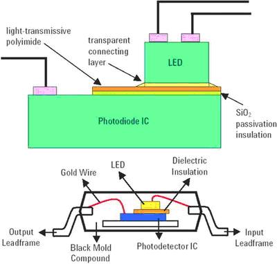 光電二極管芯片采用兩個(gè)透明的層:SiO2鈍化/絕緣和光傳導(dǎo)聚酰亞胺。LED使用透明的連接層穩(wěn)固地連接到光電二極管上。IC使用銀環(huán)氧樹脂,通過(guò)模具連接到引線框上。介電材料使用光傳導(dǎo)環(huán)氧樹脂連接到IC上。LED模具使用光傳導(dǎo)環(huán)氧樹脂連接到介電材料上。最后,組件使用焊接線和澆鑄。它使用標(biāo)準(zhǔn)模具連接工藝,完成所有放置,封裝在單次不透明澆鑄化合物中完成澆鑄。