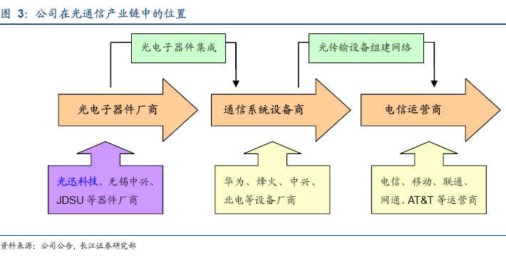 全球光通信行業(yè)長期向好--公司增長的基礎(chǔ)如圖3所示,光迅科技處于光通信產(chǎn)業(yè)鏈的上游位置,故公司的增長前景,取決于光通信行業(yè)的未來趨勢。