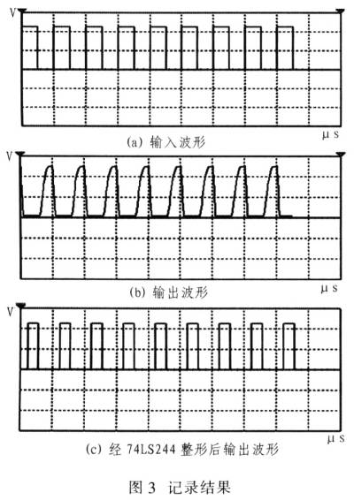 調(diào)試中,輸入周期為100μs,占空比為1/2的+5V方波,對(duì)一路光耦的輸入端波形和經(jīng)過20m長線后接收光耦的輸出端波形以及經(jīng)過74LS244整形后的波形進(jìn)行記錄。記錄結(jié)果如圖3所示。