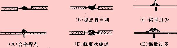 ?。ǎ粒┧緫?yīng)是錫點(diǎn)光亮,圓滑而無毛刺,錫量適中。錫和被焊物融合牢固。不應(yīng)有虛焊和假焊。