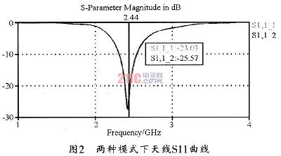 [page]由于兩種工作狀態(tài)下,天線的接地端不同,因此,天線的有效輻射部分也有所不同。當處于X模式時,天線結(jié)構(gòu)中垂直部分的微帶線接地,因此,天線的輻射部分應(yīng)該為水平部分的微帶,天線也相應(yīng)工作在水平極化方式。圖3所示為天線在2.44GHz時的射頻電流分布圖。
