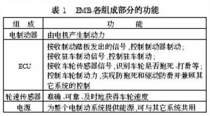 EMB主要用于小型車輛中,主要包含電制動器、ECU、輪速傳感器、動力電源等。它與EHB最大區(qū)別是制動力為電機(jī)提供的轉(zhuǎn)矩,而不是由柱塞泵產(chǎn)生的高壓油,且有獨立的電源來供電,其各部分的功能如表1。