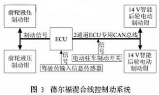 混合線控制動系統(tǒng)是一種新型的制動系統(tǒng),該系統(tǒng)由德爾福公司推出,主要用于乘用車、SUV和輕型汽車。這種系統(tǒng)將成為采用電子控制的電制動線控技術(shù)的重要基礎(chǔ),它用后輪電動制動鉗來代替?zhèn)鹘y(tǒng)后輪液壓制動鉗,并與電動駐車制動集成,而傳統(tǒng)的液壓制動鉗/真空助力器仍應(yīng)用于前輪制動,其結(jié)構(gòu)如圖3所示。