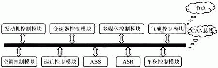 現(xiàn)代汽車典刑的控制單元有發(fā)動機(jī)控制模塊、變速器控制模塊、多媒體控制模塊、氣囊控制模塊、空調(diào)控制模塊、巡航控制模塊、車身控制模塊(包括照明指示和車窗、刮雨器等)、防抱死制動系統(tǒng)(ABS)防滑控制系統(tǒng)(ASR)等。完善的汽車CAN總線網(wǎng)絡(luò)系統(tǒng)架構(gòu)如圖1所示。