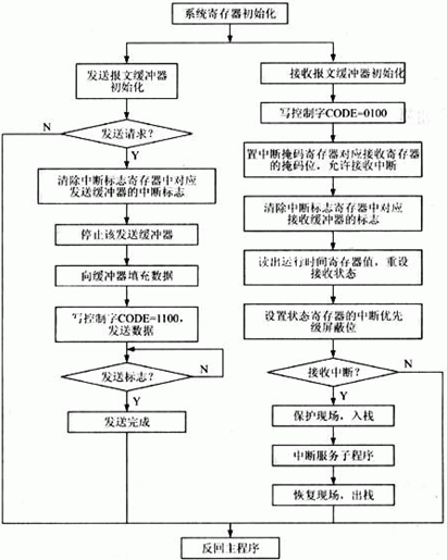 各控制器應(yīng)按規(guī)定格式和周期發(fā)送數(shù)據(jù)到總線上,同時也要接受其他控制器的信息??偩€上的其他控制器則根據(jù)需要各取所需的報(bào)文。對于接收數(shù)據(jù),本系統(tǒng)采用中斷方式實(shí)現(xiàn)。一旦中斷發(fā)生,即將接收的數(shù)據(jù)自動裝載到相應(yīng)的報(bào)文寄存器中,此時還可采用屏蔽濾波方式,利用屏蔽濾波寄存器對接收報(bào)文的標(biāo)識符和預(yù)先在接收緩沖器初始化時設(shè)定的標(biāo)識符進(jìn)行有選擇地逐位比較,只有標(biāo)識符匹配的報(bào)文才能進(jìn)入接收緩沖器,那些不符合要求的報(bào)文則將被屏蔽于接收緩沖器之外,從而減輕CPU處理報(bào)文的負(fù)擔(dān)。此外,不同數(shù)據(jù)應(yīng)放入不同的報(bào)文寄存器中,因此在接收中斷服務(wù)程序中,就可以容易地判斷出中斷是由哪個接收報(bào)文引起的,其程序流程圖如圖3所示。
