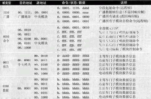 本協(xié)議遵循CAN2.0B規(guī)范,根據(jù)車身控制模塊的特點(diǎn),采用源→目的方法,每個節(jié)點(diǎn)都有自己固定的標(biāo)識地址,且節(jié)點(diǎn)數(shù)小于64,設(shè)計(jì)時可將中央控制模塊設(shè)為主節(jié)點(diǎn),而將車門、電動座椅子模塊及自檢子模塊設(shè)置為從節(jié)點(diǎn)。本協(xié)議可完成以下功能: