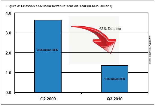 今年7月,諾基亞西門子通信和愛立信報告稱,其第二季度營業(yè)收入因印度的審查延誤而大幅減少。諾基亞西門子通信稱減少2.57億美元。愛立信沒有給出具體的損失數(shù)字,但該公司在印度的營業(yè)收入同比下降63%,相當于總計損失了3.12億美元,如圖3所示。