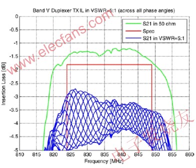 圖3:當手機的窄帶雙工或接收濾波器沒有端接到其特征阻抗時,在通帶中也會出現紋波。本例中,VSWR為5:1的阻抗失配使插入損耗大幅度增加。