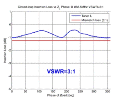 圖4:對自適應閉環(huán)系統(tǒng)的仿真顯示,與未使用天線調諧器的系統(tǒng)(紅線)相比,加入天線調諧器(藍線)可降低插入損耗。