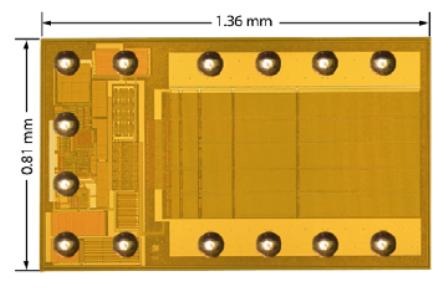 Peregrine半導體公司的設計人員已基于該公司的UltraCMOS工藝和HaRP創(chuàng)新設計開發(fā)出DuNE技術,并已申報專利。DuNE數字可調電容器(DTC)芯片是為滿足天線調諧要求而設計的,它內含一些高Q值電容和一個串行接口,并具有偏置電壓低和線性度高的優(yōu)點。該器件采用倒裝芯片封裝,面向GSM/WCDMA手機的DuNEDTC的尺寸為1.36×0.81mm(見圖5)。