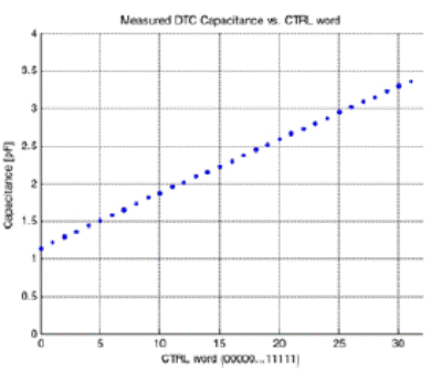 圖6:實測結果表明,5位DuNEDTC器件具有良好的線性調諧特性,電容范圍為1.15到3.4pF(調諧比為3:1)。