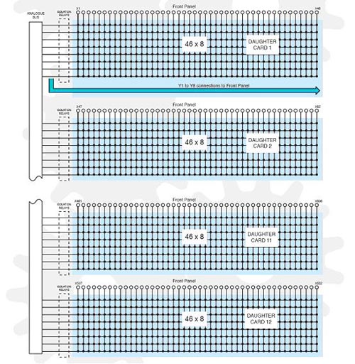 主子板卡決定了Y軸的尺寸,而其他子板卡只是擴(kuò)展了X軸上的點(diǎn)數(shù)。每個(gè)子板卡在Y軸尺寸上必須和主子板卡相同,根據(jù)不同版本的BRIC選擇其他不同的子板卡。BRIC在Y軸尺寸上有4,8,16這幾種標(biāo)準(zhǔn)尺寸,要想獲得其他的尺寸就需要減少板卡上的繼電器數(shù)量即可。除了一個(gè)柱上開關(guān)外,可以提供的還有屏蔽的和2個(gè)柱上開關(guān)的矩陣形式。