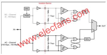 高速信號由AC通道來處理,信號在通道中首先從單端模式轉(zhuǎn)換為差分模式,然后被隔離層的電容-電阻網(wǎng)絡(luò)差分為許多瞬態(tài)。后面的比較器再將這些瞬態(tài)轉(zhuǎn)換為差分脈沖,從而設(shè)置和重置一個“或非”門觸發(fā)器。相當(dāng)于原始輸入信號的觸發(fā)器輸出饋至判定邏輯(DCL)和輸出多路復(fù)用器。DCL包括一個看門狗定時器,該定時器用于測量信號轉(zhuǎn)換之間的持續(xù)時間。如果兩個連續(xù)轉(zhuǎn)換之間的持續(xù)時間超出定時窗口(如低頻信號的情況下),則DCL則指示輸出多路復(fù)用器從AC-通道切換到DC-通道。