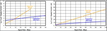 圖3電容和電感隔離器的電流消耗(左圖為雙通道隔離器,右圖為四通道隔離器)
