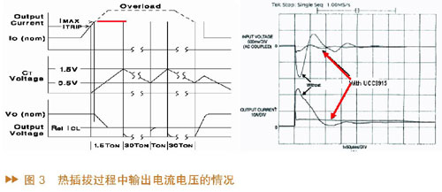 接下來以UCC3915為例說明熱插拔過程中輸出電流電壓的情況。圖3中,左邊圖形是UCC3915的輸出電流、輸出電壓、即時電容電壓的波形,可以看到當(dāng)輸出電流上升到ITRIP時,計時電容開始充電,電壓上升,開始計時;如果輸出電流超過ITRIP并一直上升到IMAX(設(shè)定的最大值),由于此時MOS管工作在線性模式,將最大輸出電流限制在這一水平而不讓輸出電流上升,因此輸出電流就會被限制在IMAX。