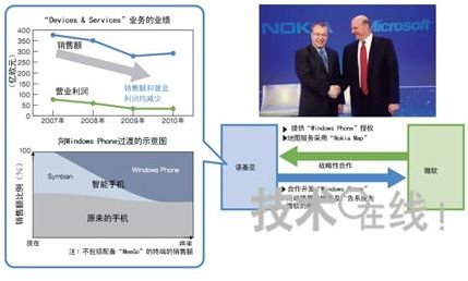在移動產(chǎn)品的全球最大規(guī)模展會“Mobile World Congress 2011”(2011年2月14~17日)開幕前的2月11日,諾基亞宣布了“歷史性”戰(zhàn)略轉(zhuǎn)換方針。該公司將與美國微軟進行戰(zhàn)略合作,合作內(nèi)容包括采用“Windows Phone”作為智能手機的主要平臺等(圖1)。