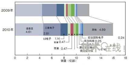 2010年的手機全球銷量比上年增加31.8%,約為16億部。RIM、蘋果、ZTE、HTC以及華為的銷量順利增長,但LG、索尼愛立信和摩托羅拉移動等的銷量則出現(xiàn)減少。(圖:Gartner,2011年2月發(fā)行)