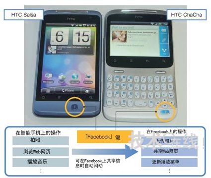 HTC發(fā)布了兩款適合使用SNS“Facebook”的智能手機。當利用攝像頭拍照等預(yù)測用戶想在Facebook上共享信息時,F(xiàn)acebook鍵會自動閃光。摁下該鍵就會進入上傳信息的畫面。